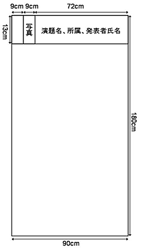 - 貼り付け可能⾯が幅90cm×⾼さ180cmのパネルを⽤意します。右上部の幅72の範囲に「演題名」「所属」「発表者名」を、演題名左に「演者の顔写真(L判、 カラー)」を添付してください。演題番号は⼤会本部で⽤意します。